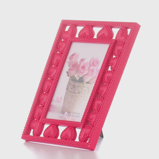 Decorative photo frame made of red plastic, with a heart-shaped design on the contour. Easily integrates into home decor or as a symbolic element for special events.