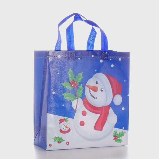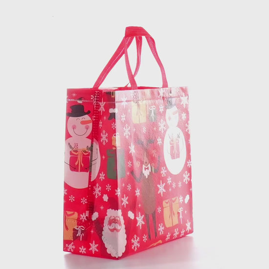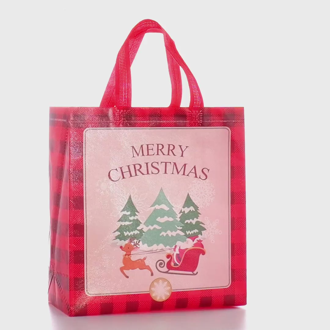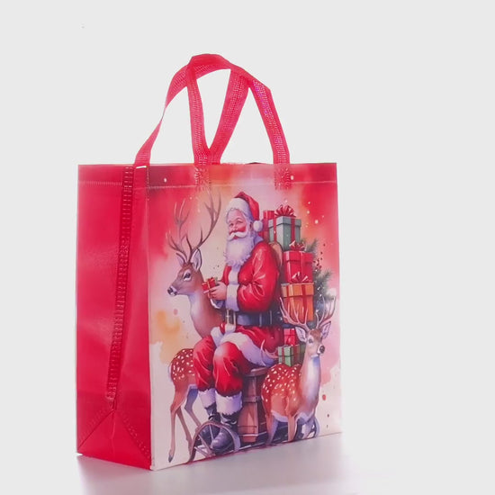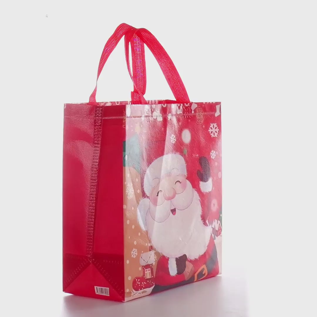 Sacoșă textilă reutilizabilă cu tematică de Crăciun, realizată din polipropilenă netesută (non-woven), rezistentă și practică pentru ambalarea și transportul cadourilor de sărbători. Baza lată de 12 cm îi permite să stea în picioare, oferind stabilitate pentru obiectele ambalate.